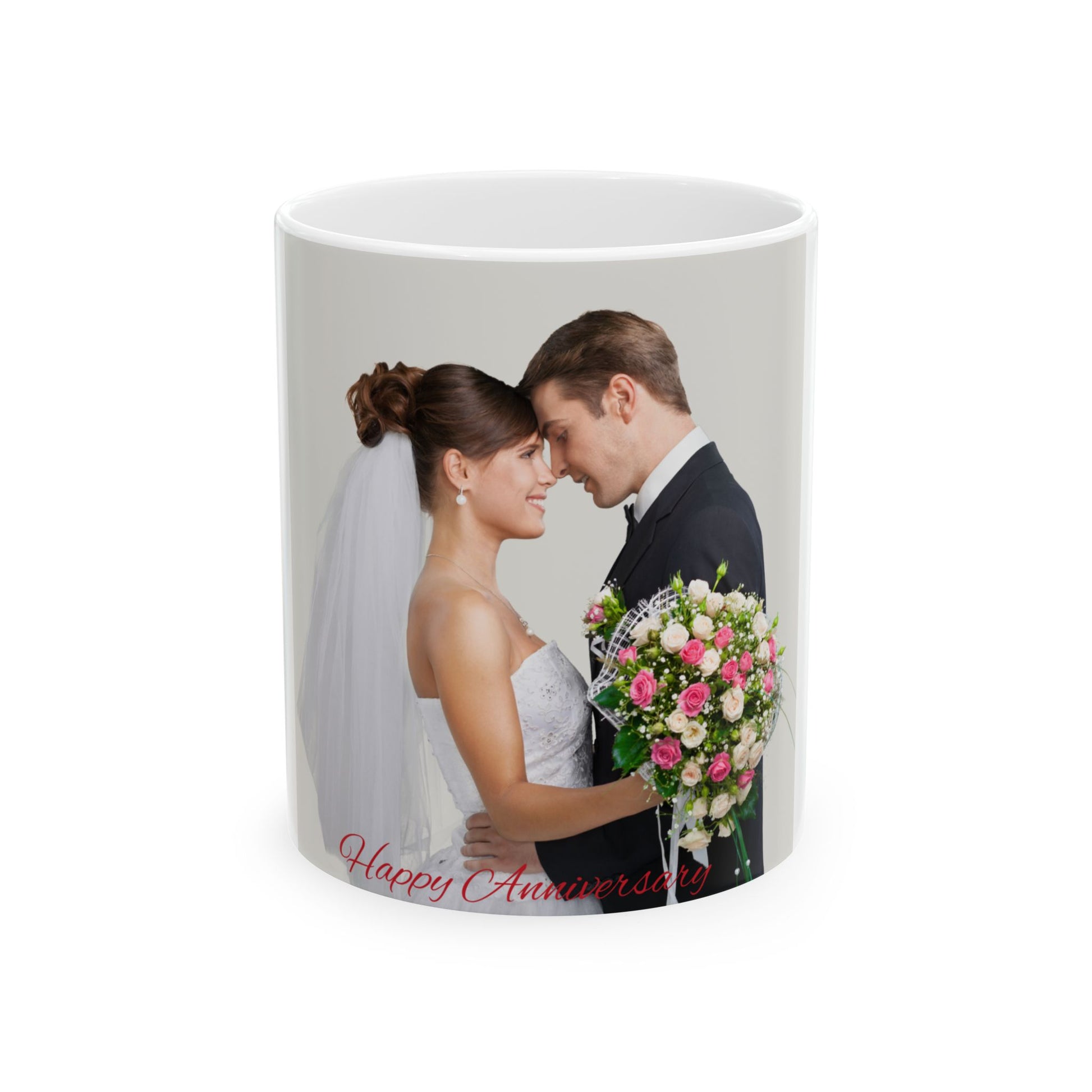 A ceramic mug with a glossy finish, featuring a wedding anniversary photo. Perfect for celebrating milestones and reminiscing on special memories. Ideal for couples celebrating their wedding anniversary.